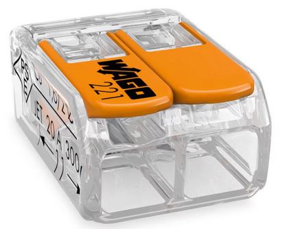 Основным отличием клемм WAGO 221-… от WAGO 2273-… является возможность присоединения провода с наборной (многопроволочной) жилой и многоразовость. Клемма WAGO 221-… в отличии от WAGO 222-… меньше по размеру более стойкие к температурным нагрузкам. При этом надо помнить, что в одно отверстие подключается одна жила, в противном случае контакт может оказаться ненадежным это повлечет перегрев. Допускается для монтажа одиночных (цельнотянутых) жил сечение 0,2 до 4 мм и многопроволочных (наборных) жил сечением от 0,14 до 4 мм.