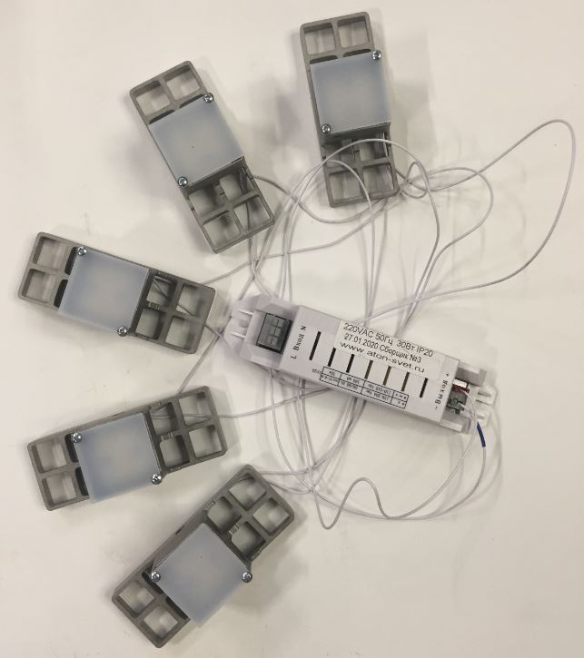 ВНИМАНИЕ! Нельзя перегружать блоки питания перераспределяя нагрузку, т.е. взять два светильника на первом оставить 4 светотехнических модуля, освободившийся подсоединить ко второму светильнику шестым, это приведет к выходу из строя блока питания.
